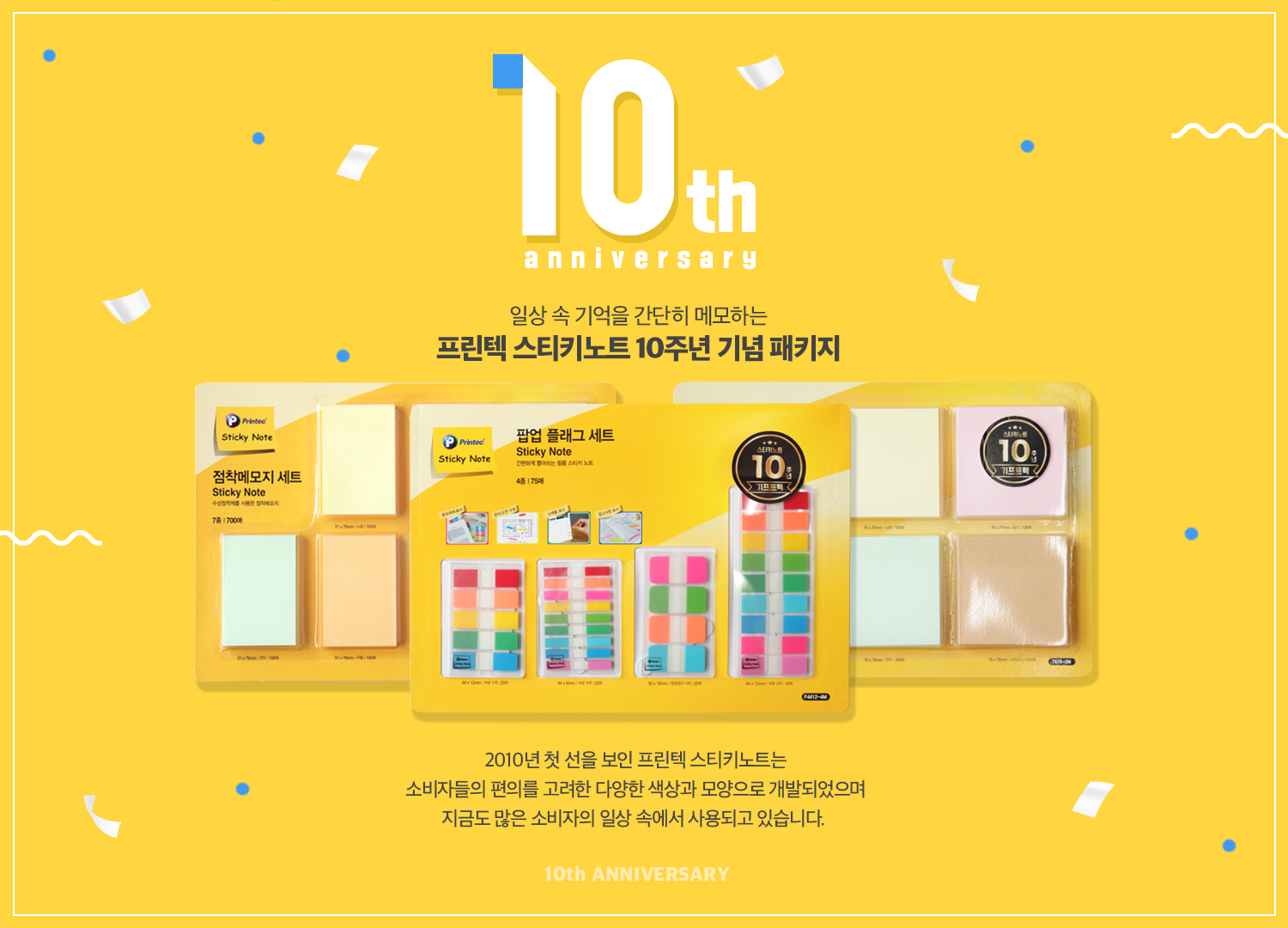 생활 문구, IT 기반 응용 문구 제조업체인 프린텍이 스티키노트 출시 10주년을 맞아 ‘스티키노트 10주년 패키지 3종’을 출시했다.